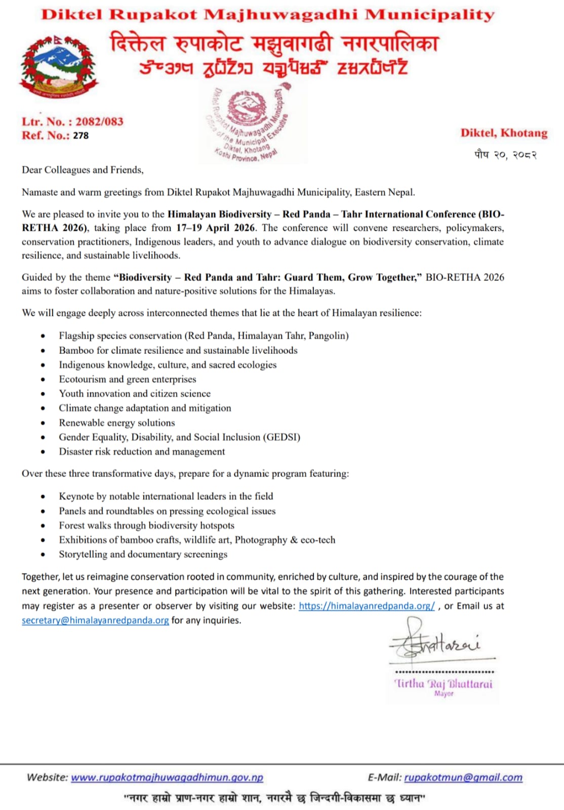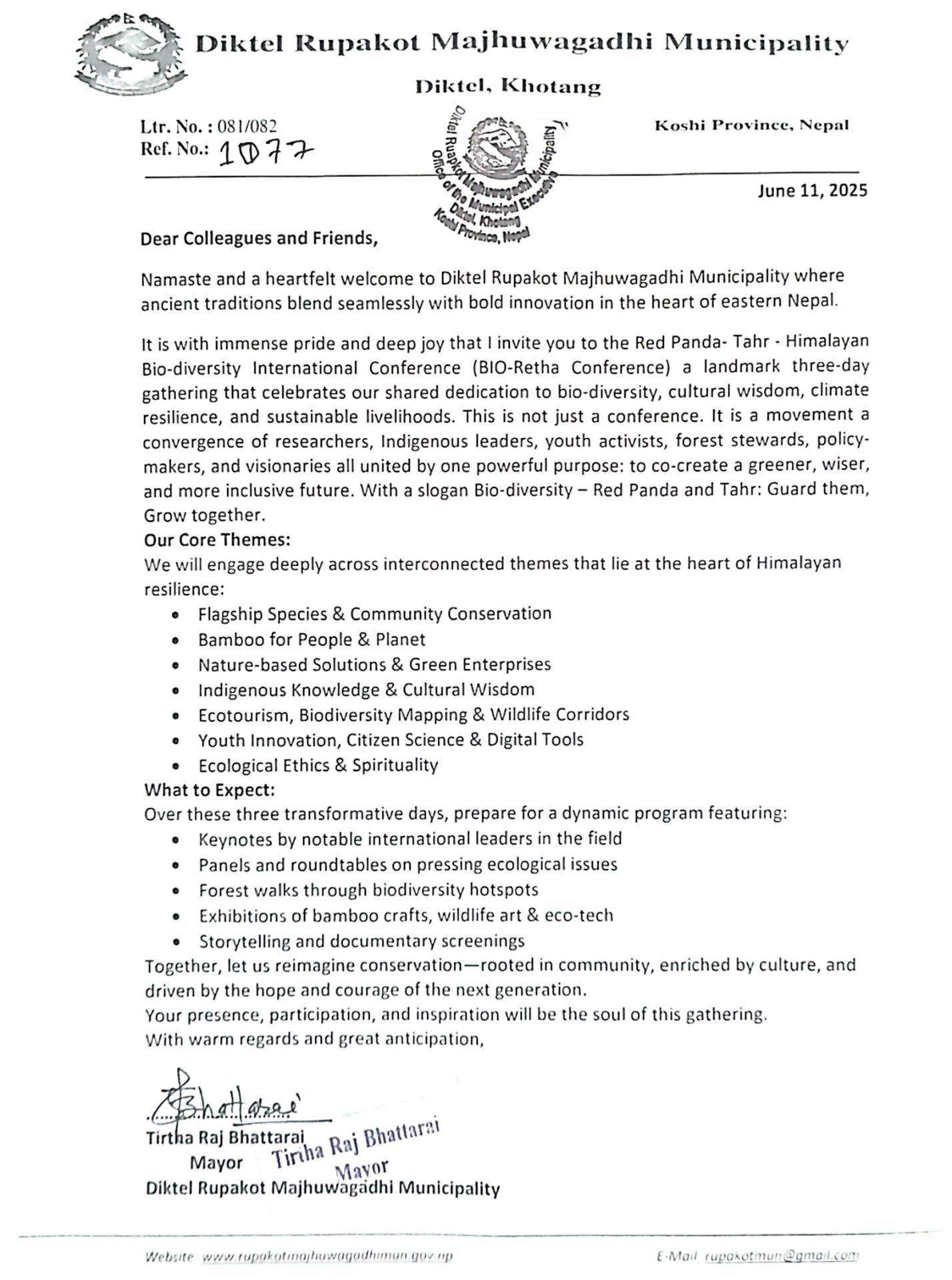 We are honored to welcome researchers, conservationists, and community leaders from around the world to our beautiful municipality. Together, we will work towards preserving the rich biodiversity of our Himalayan region while supporting sustainable community development.